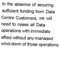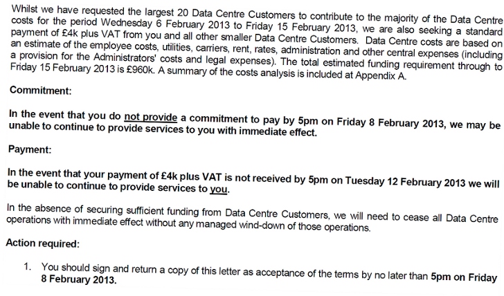 For 2e2’s customers, the immediate problem is a demand for funding to keep the lights on in the datacenter. The biggest customers are reported to have been asked for GB£40,000 (US$63,000 immediately), with smaller customers receiving letters demanding GB£4,000 (US$6,300). Non payment means disconnection of service. Worse still, there is the additional threat that if overall funding from all customers is insufficient, operations might shut down regardless: