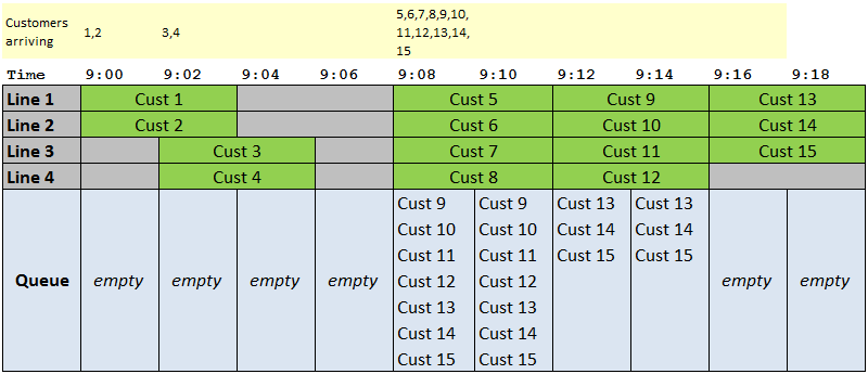 We’ve got through the callers in a relatively short time (everything is resolved by 09:16). However, that has come at a price: 30 customer-minutes of waiting time.