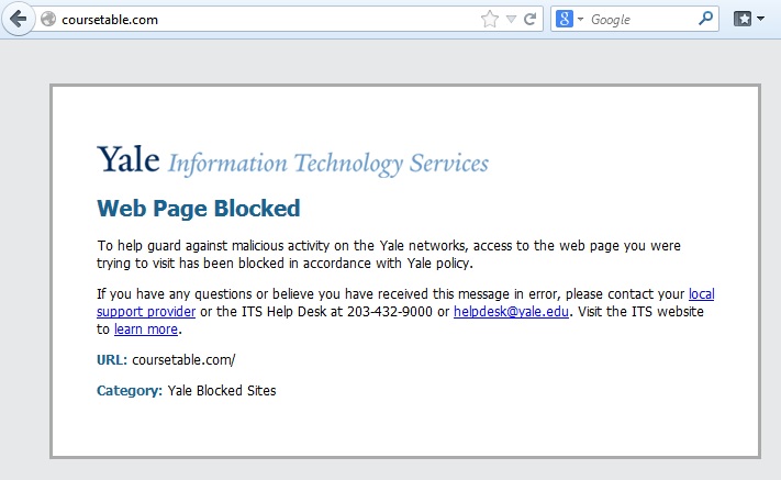 The university’s response was heavy handed to say the least. After quibbling with the students about their product’s original name (a derivation of the official platform’s own title), they went a step further and blocked the site on campus. Students attempting to access the site were confronted instead with a Yale-branded screen, purportedly “to help guard against malicious activity on Yale networks”.